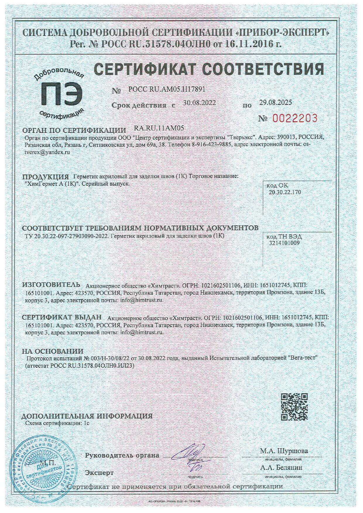 Сертификат соответствия на акриловый герметик