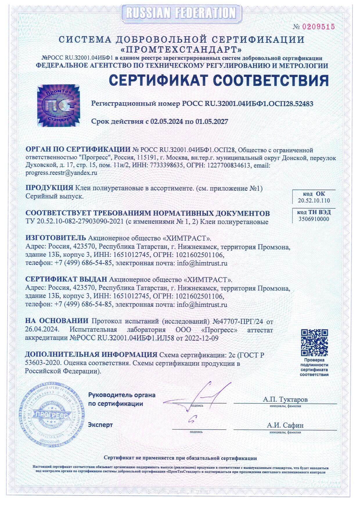 Сертификат соответствия на полиуретановый клей для изготовления покрытий
